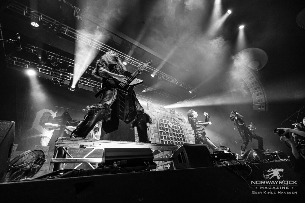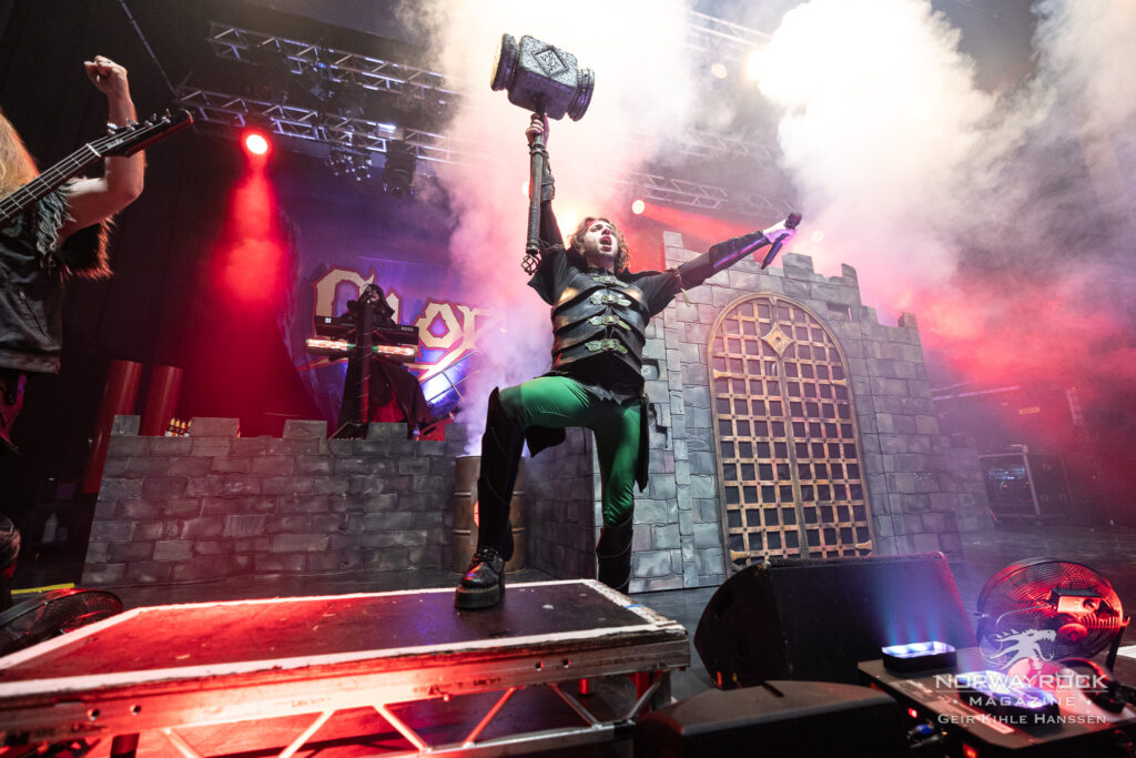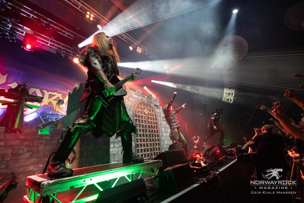 Tiden er inne for første headliner, og det er britiske Gloryhammer. Overgangen fra vikinger til det glade 80-tall blir litt underlig for meg, men det er liten tvil om at det er mange Gloryhammer-fans blant publikum når bandet entrer scenen til et øredøvende brøl. De fyrer opp «Holy Flaming Hammer of Unholy Cosmic Frost» som første låt, etterfulgt av «Gloryhammer», og stemningen er helt fantastisk. Jeg mener, de stiller med et slott på scenen! På et tidspunkt dukker det til og med opp en goblin på scenen, som selvsagt får juling av Angus McFife og slukøret må trekke seg tilbake, gutta er utvilsomt gode på historiefortelling. Lysshowet er også veldig kult, og bidrar til å sette stemningen til hver sang.